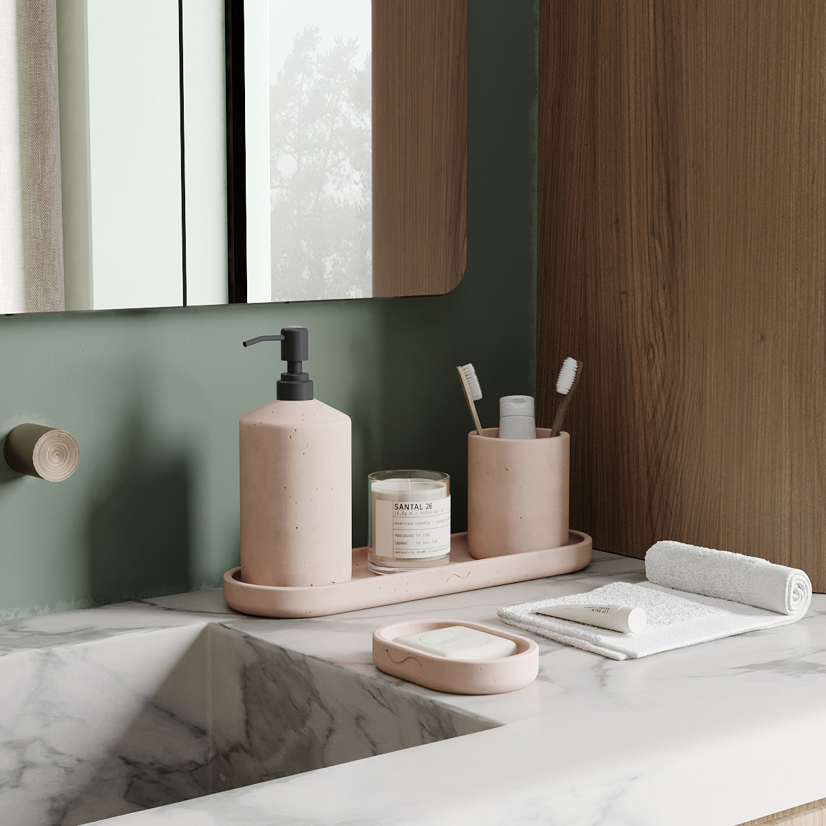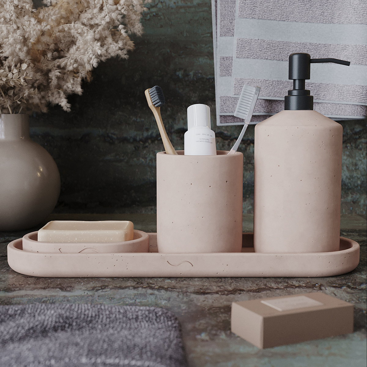 Декоративный набор для ванной комнаты Astrid 14 включает в себя четыре аксессуара: стакан для зубных щеток и пасты, поднос, дозатор и мыльницу для кускового мыла.