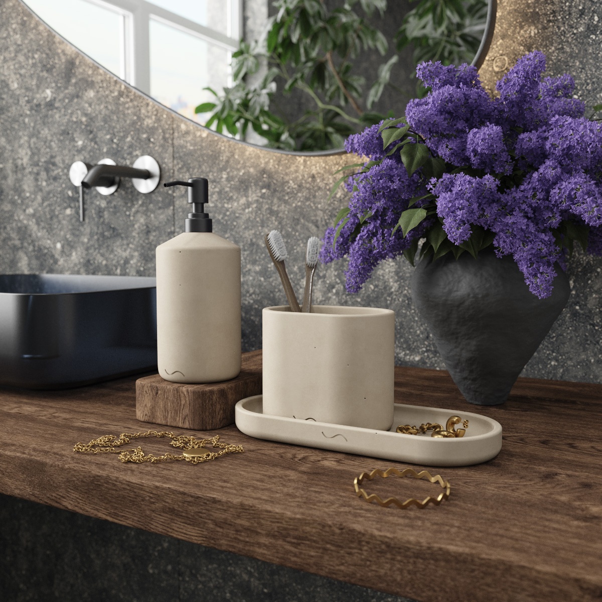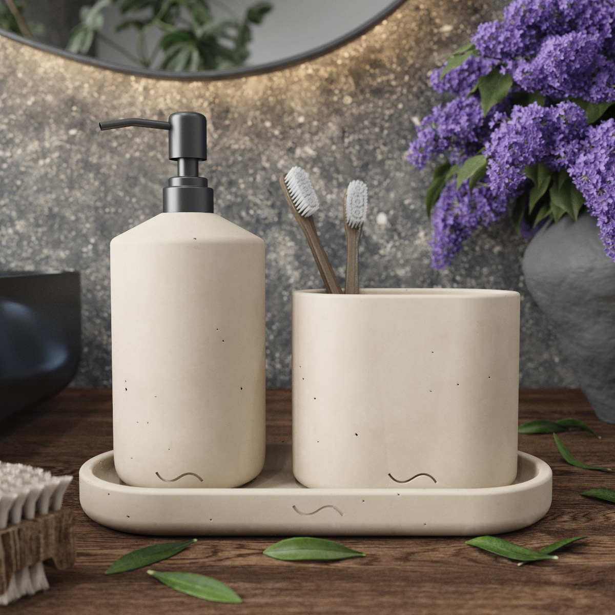 К каждому изделию в наборе прилагаются самоклеящиеся фетровые и силиконовые накладки. Набор для ванной комнаты отлично подойдет в качестве подарка. Лаконичный дизайн бетонных изделий позволяет им идеально вписаться в любой интерьер.