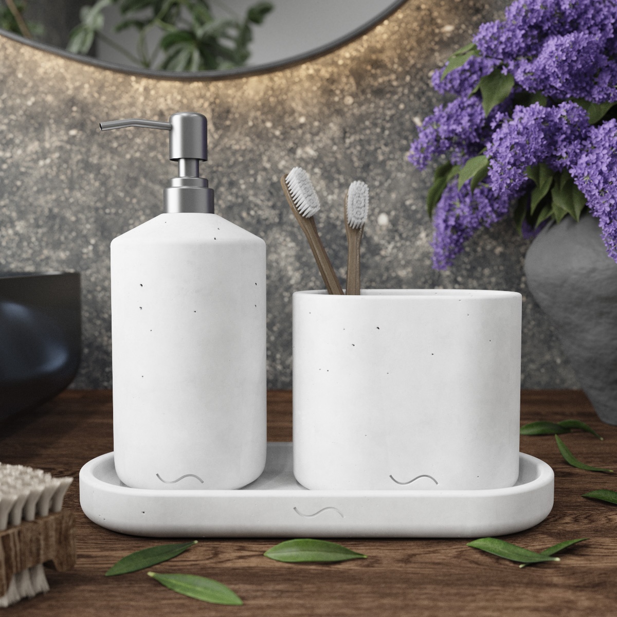 К каждому изделию в наборе прилагаются самоклеящиеся фетровые и силиконовые накладки. Набор для ванной комнаты отлично подойдет в качестве подарка. Лаконичный дизайн бетонных изделий позволяет им идеально вписаться в любой интерьер.
