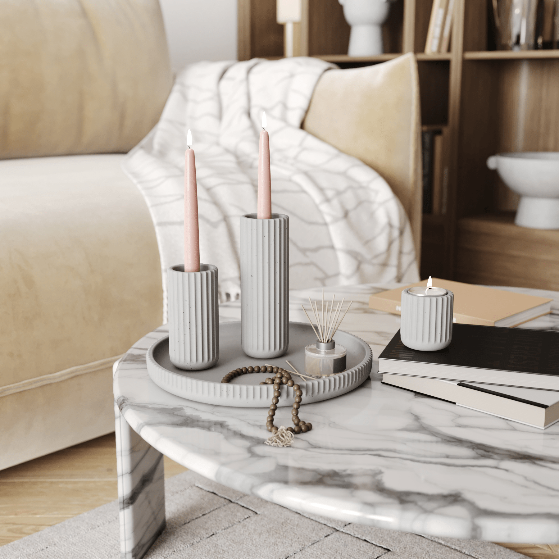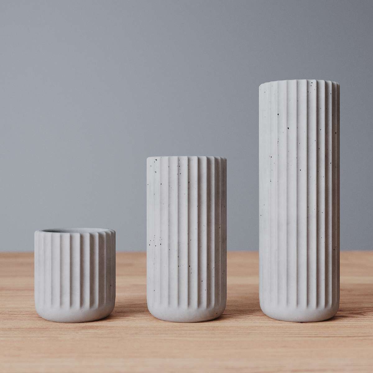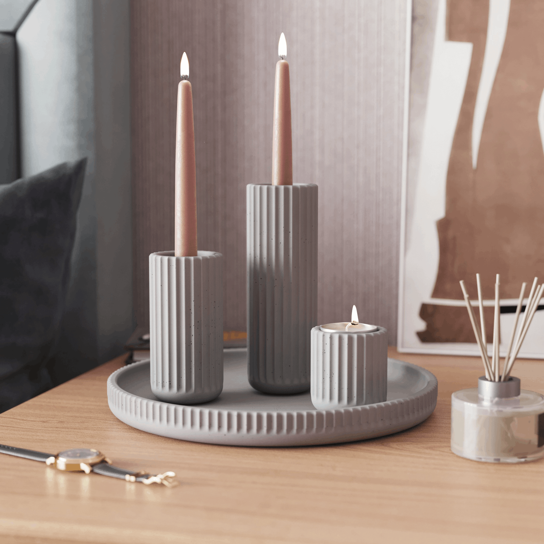 Набор подсвечников Chloe Slim S+M+L — это три декоративных подсвечника для чайных и столовых свечей с на подносе. Все изделия изготовлены вручную из прочного архитектурного бетона.
