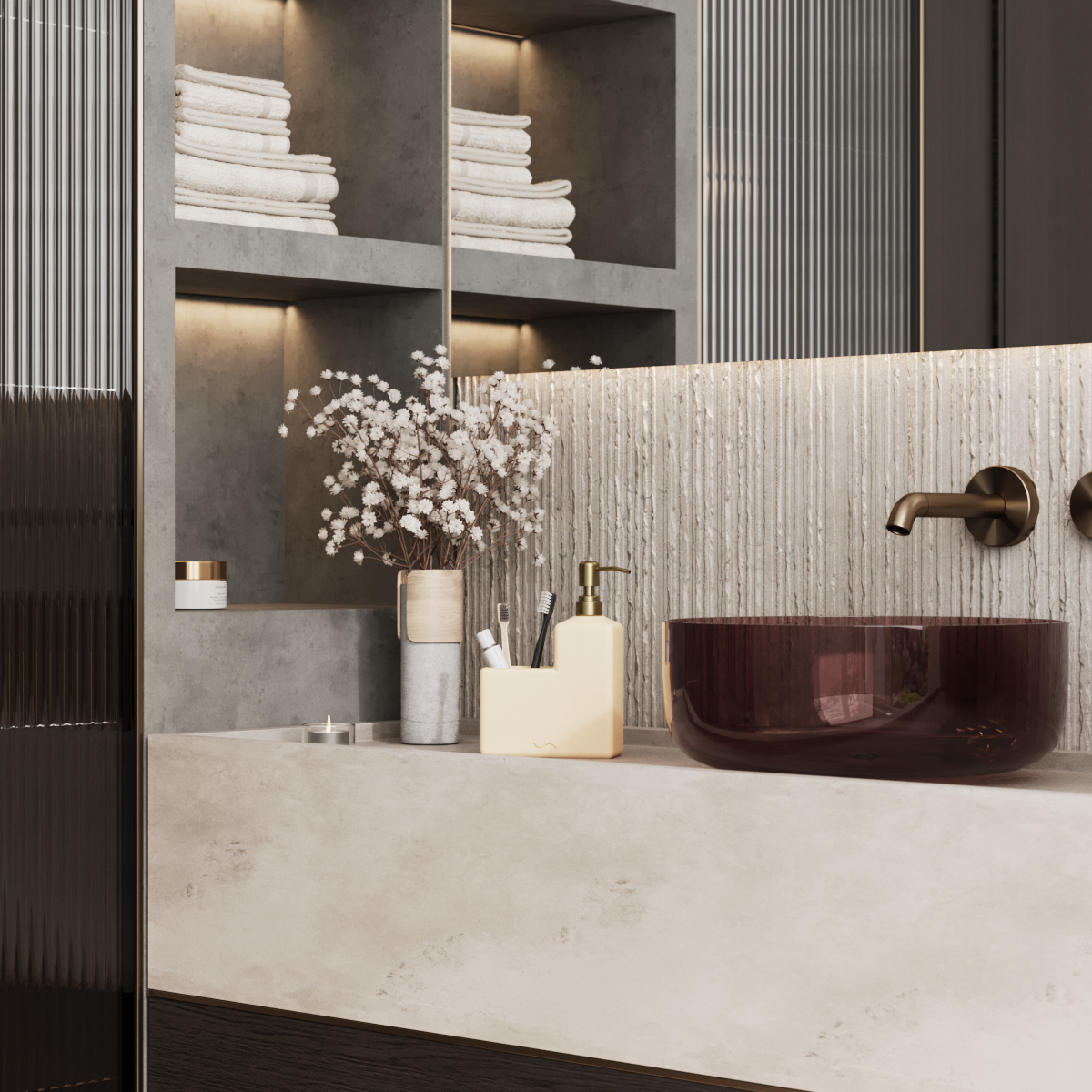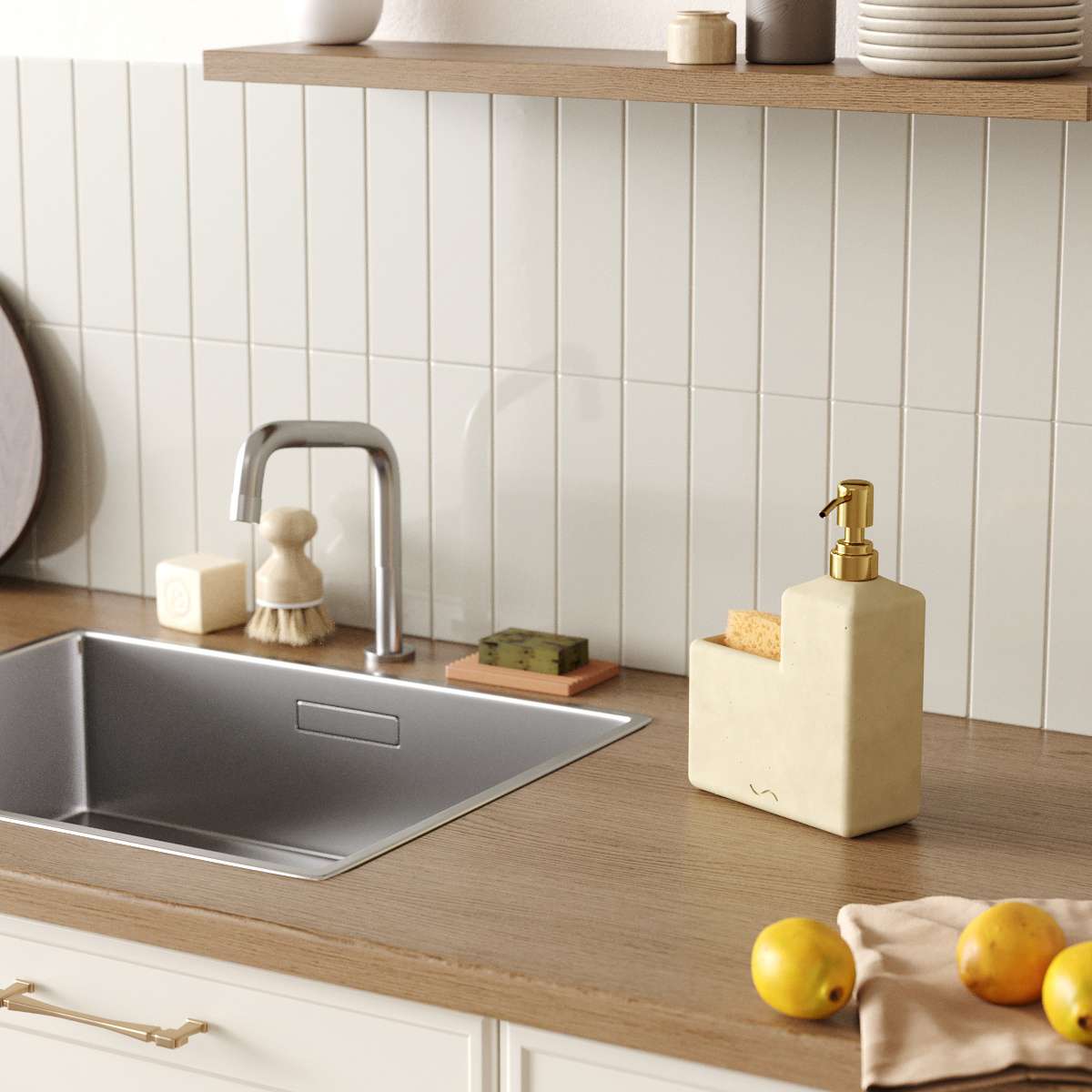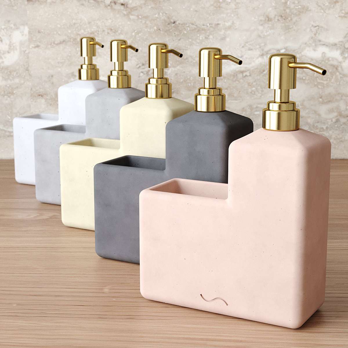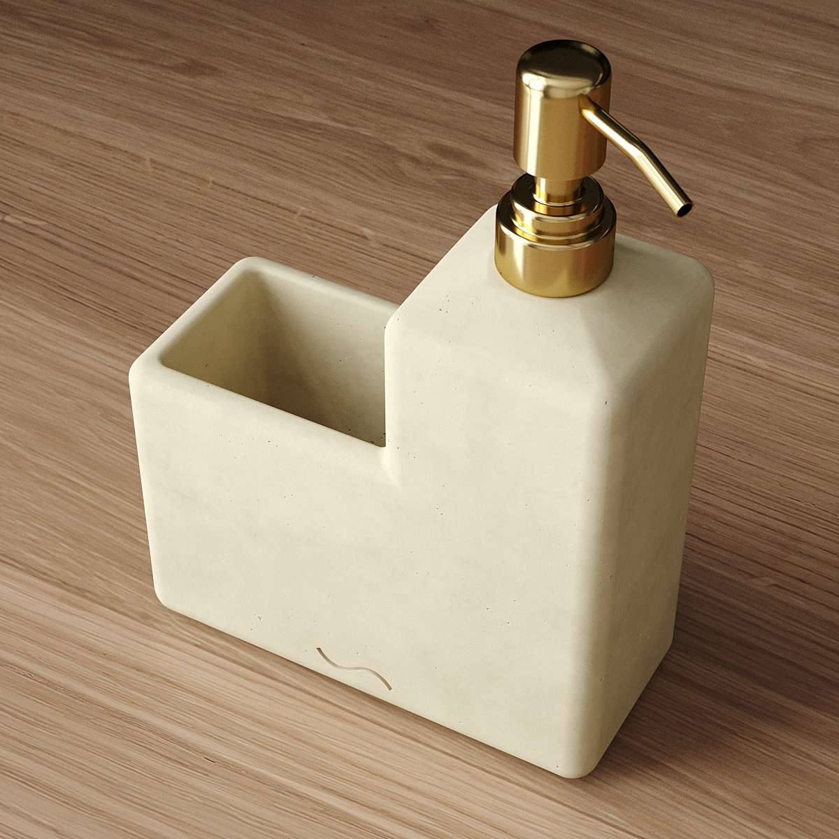 Корпус дозатора-стакана изготовлен из декоративного бетона, а помпа — из металла. Внутри дозатора находится емкость из прочного пластика.