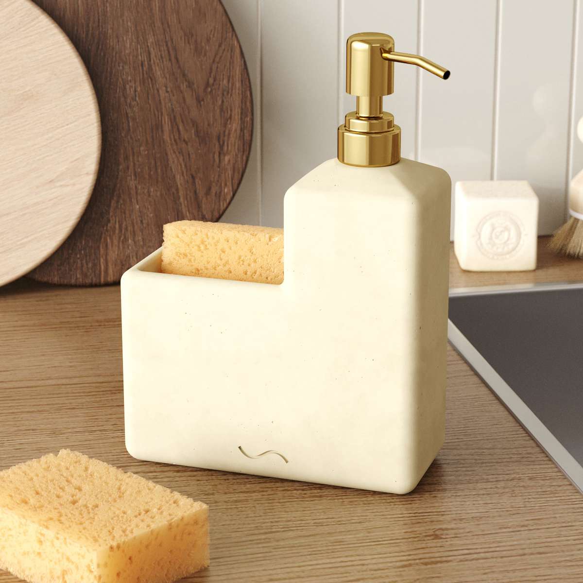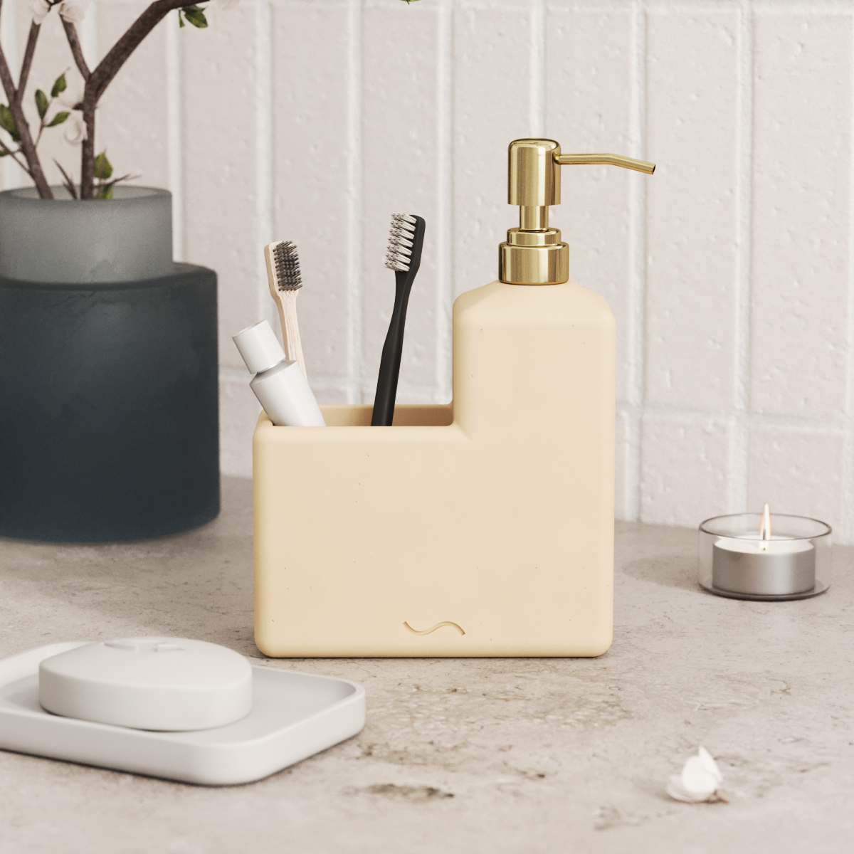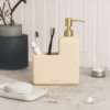 Дозатор можно использовать для хранения жидкого мыла или моющих средств. В стакане можно разместить зубные щетки и пасту, а также использовать его как подставку для губки.