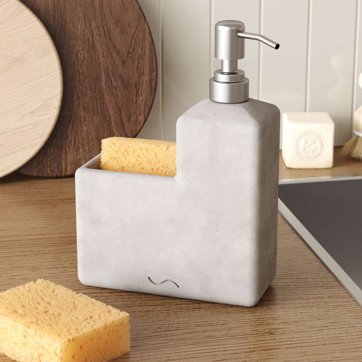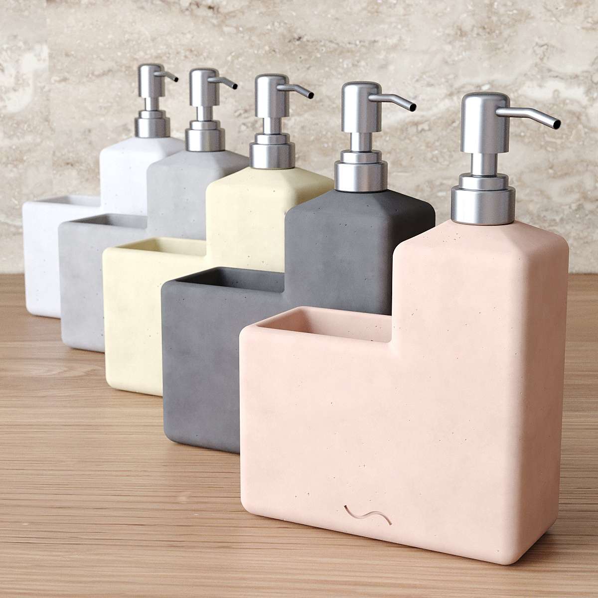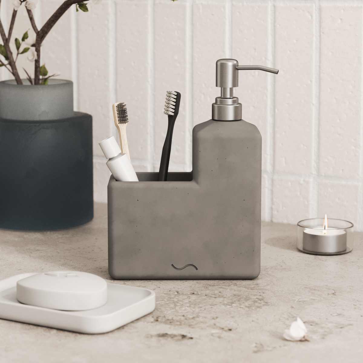 Корпус дозатора-стакана изготовлен из декоративного бетона, а помпа — из металла. Внутри дозатора находится емкость из прочного пластика.