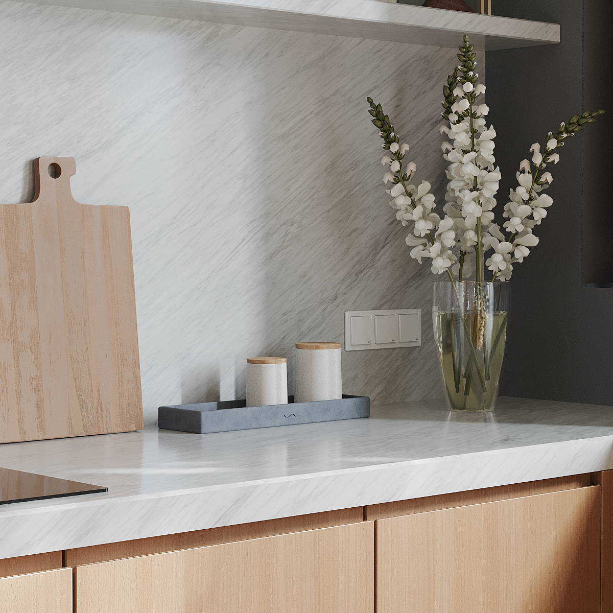 Emily M — универсальный кухонный поднос, изготовленный вручную из особо прочного бетона. Изделие обработано специальным лаком (глянцевым или матовым), защищающим поверхность от воды и грязи.