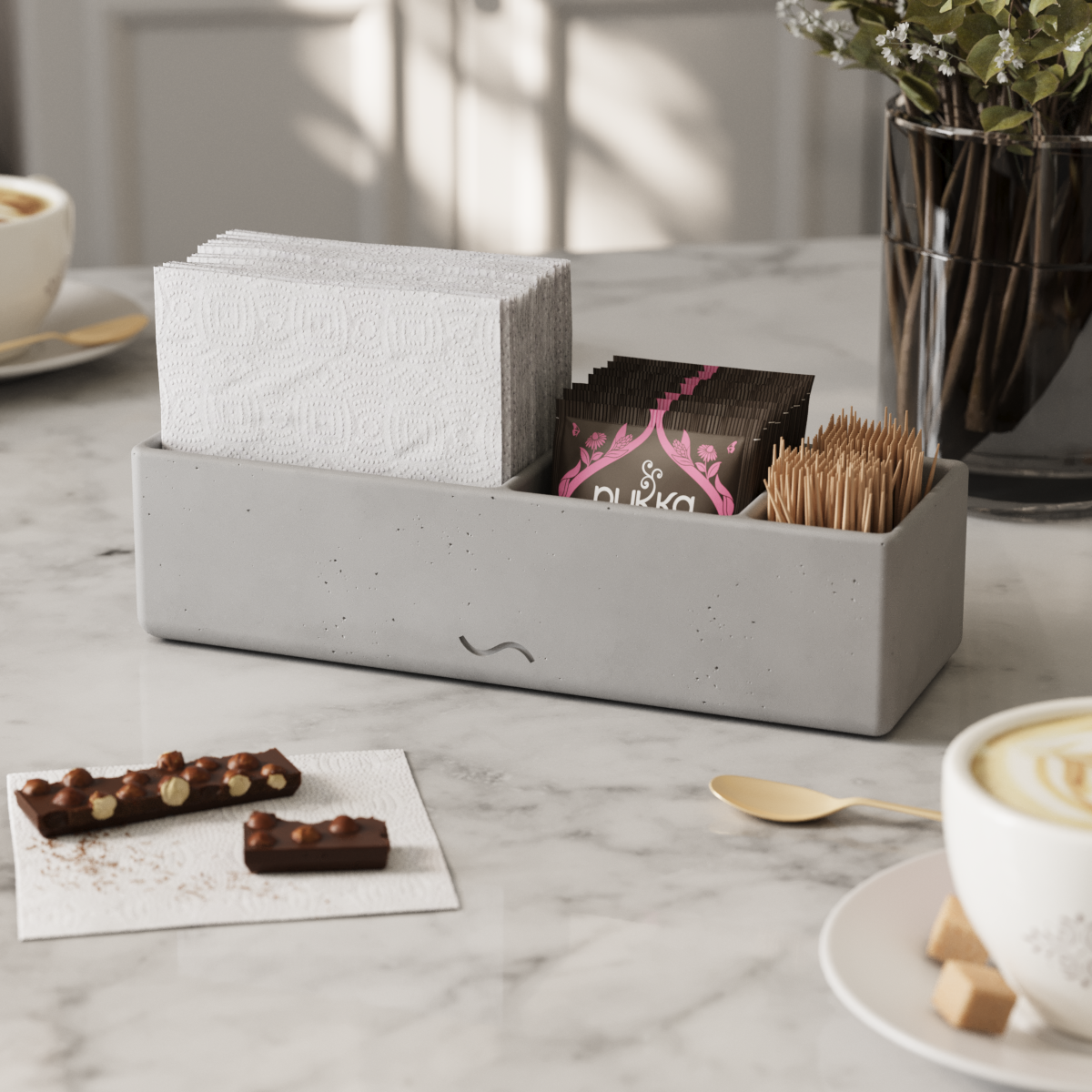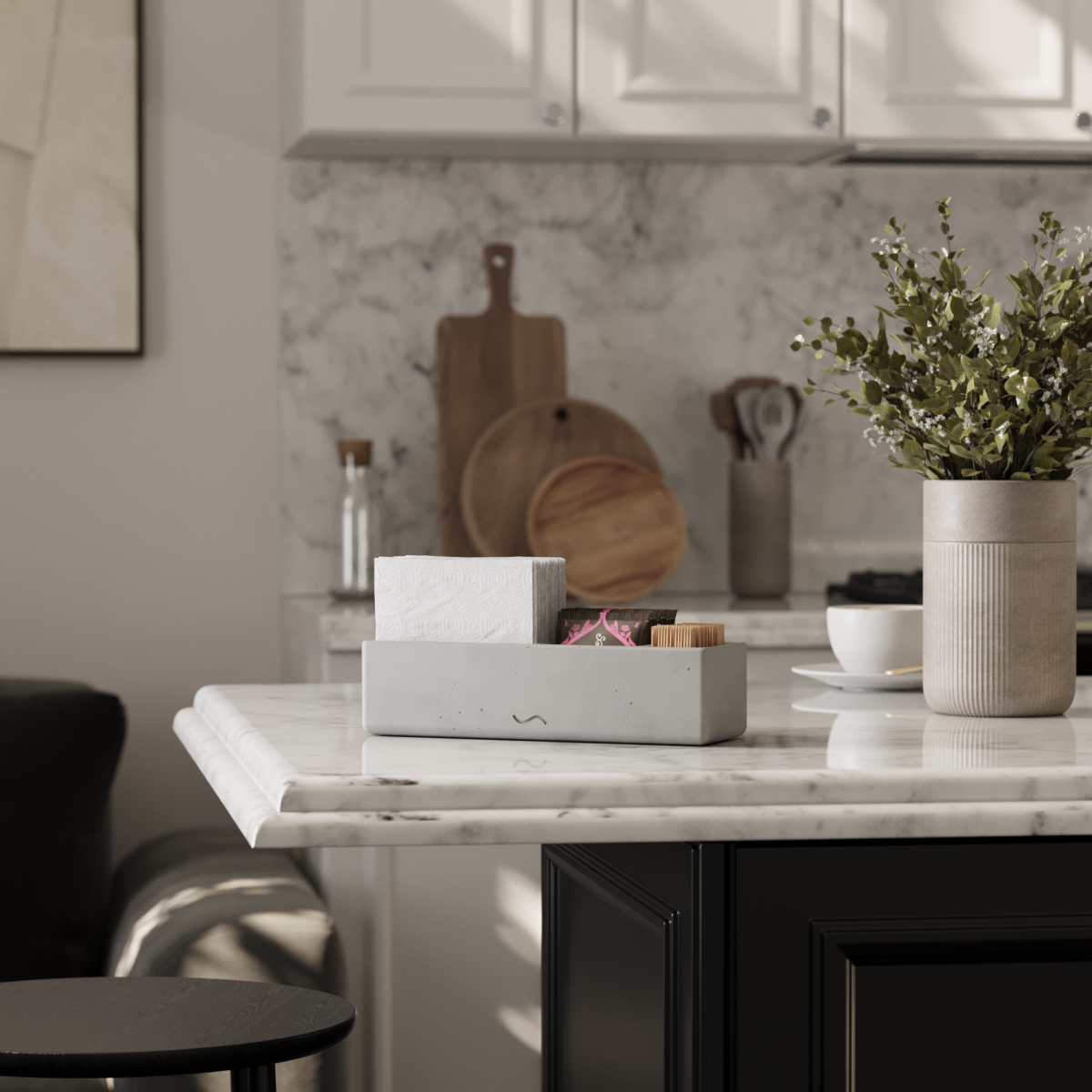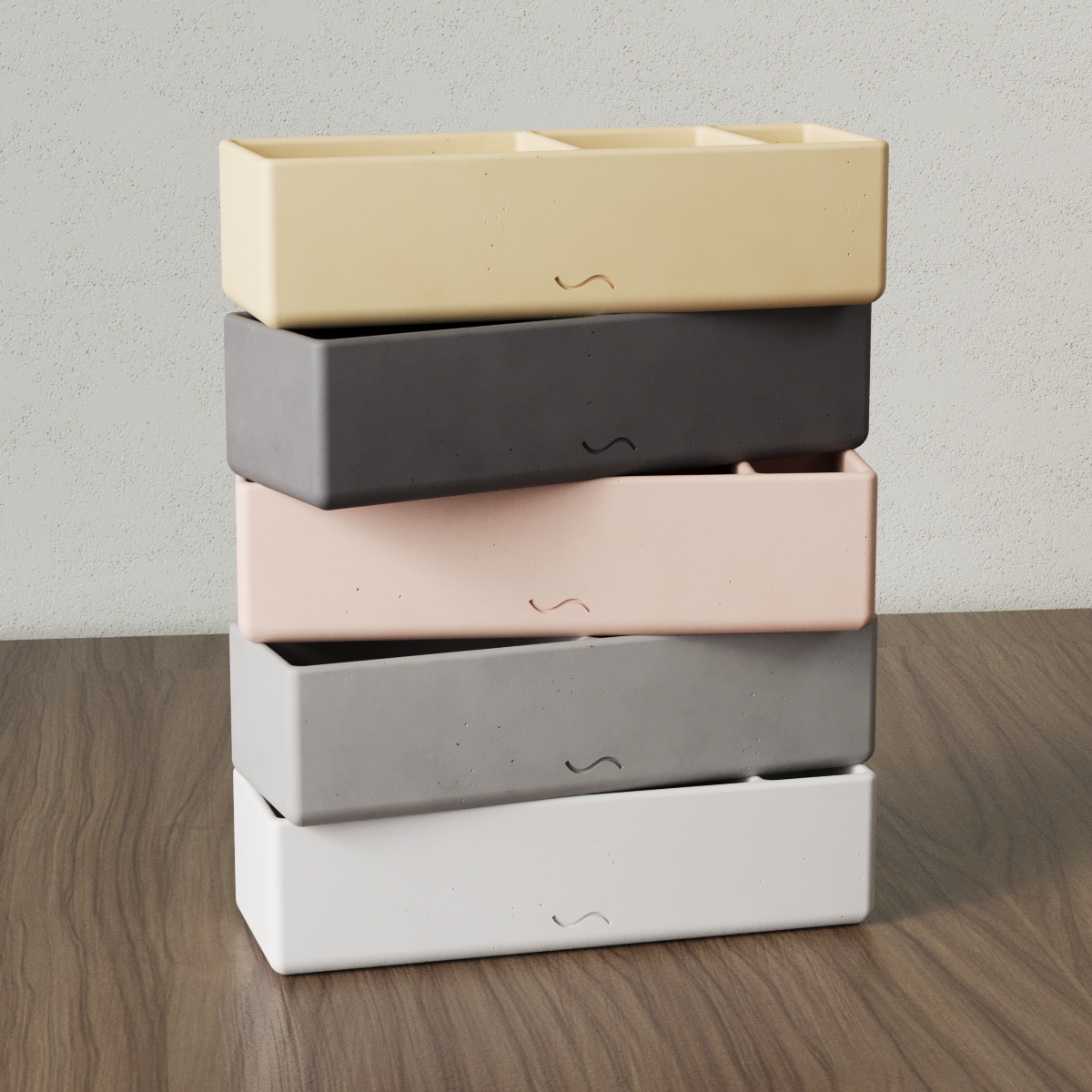 Изделие изготовлено вручную из прочного архитектурного бетона. На создание одного предмета уходит несколько дней: каждый органайзер проходит через многоэтапный цикл, в том числе шлифовку, полировку и покрытие специальным лаком.