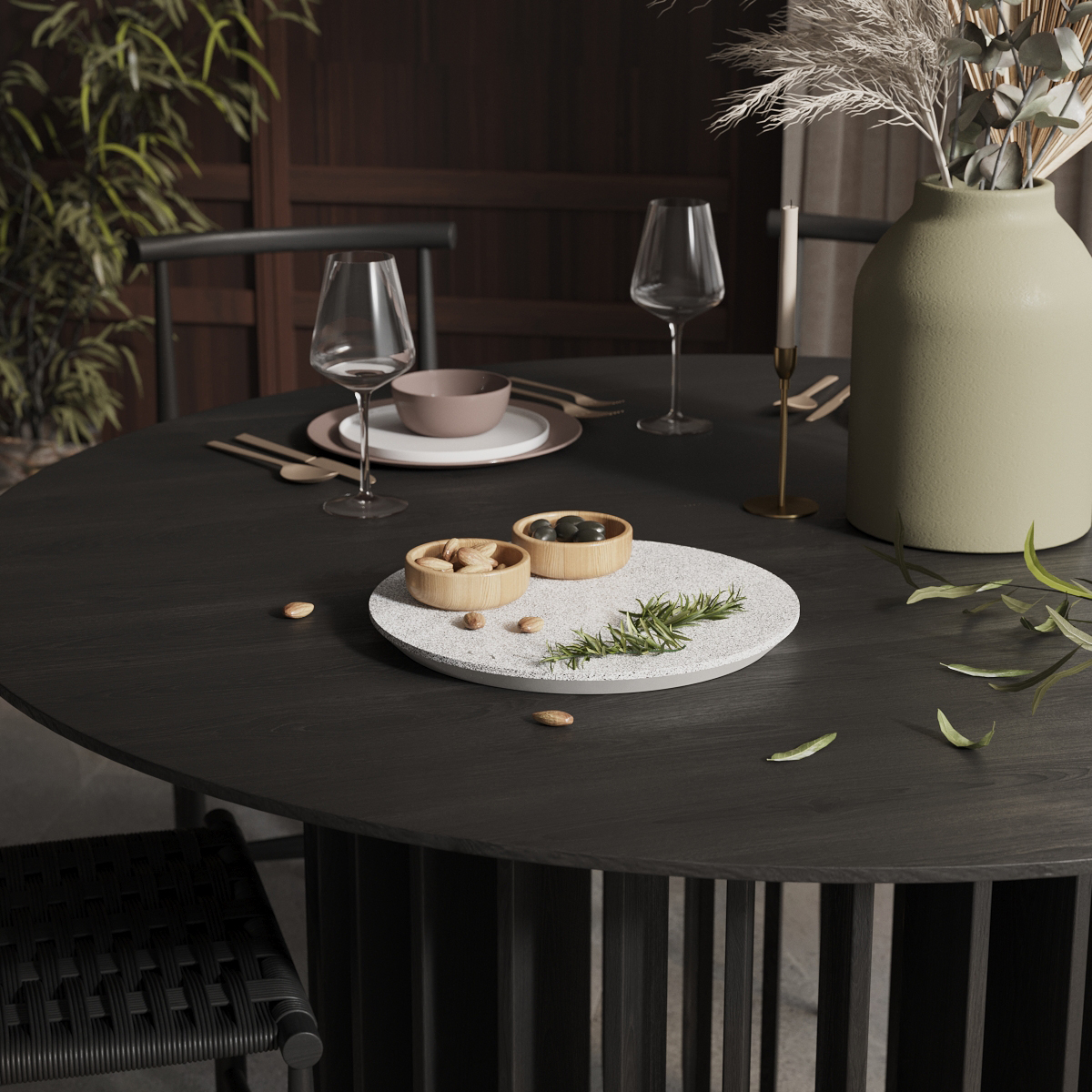 Благодаря черному кварцевому песку в составе, изделие приобрело необычные цвет и фактуру, схожие с натуральными природными камнями. Поверхность блюда гладко отполирована и покрыта специальным защитным составом.