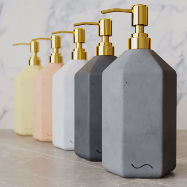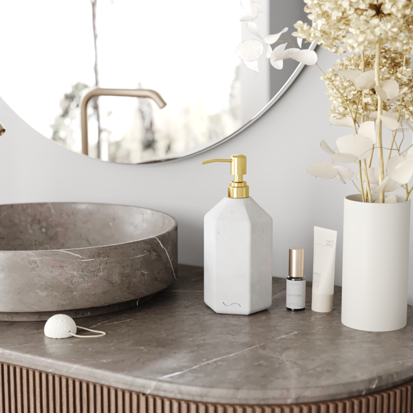 Корпус дозатора изготовлен из декоративного бетона, а помпа — из металла золотого цвета. Внутри дозатора находится емкость из прочного пластика.